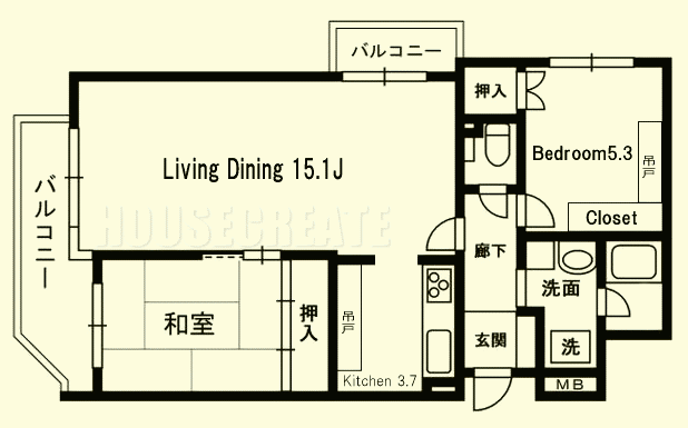●間取(専有面積)/ 2LDK(67.30㎡・LD15.1 K3.7 和6 洋5.38)